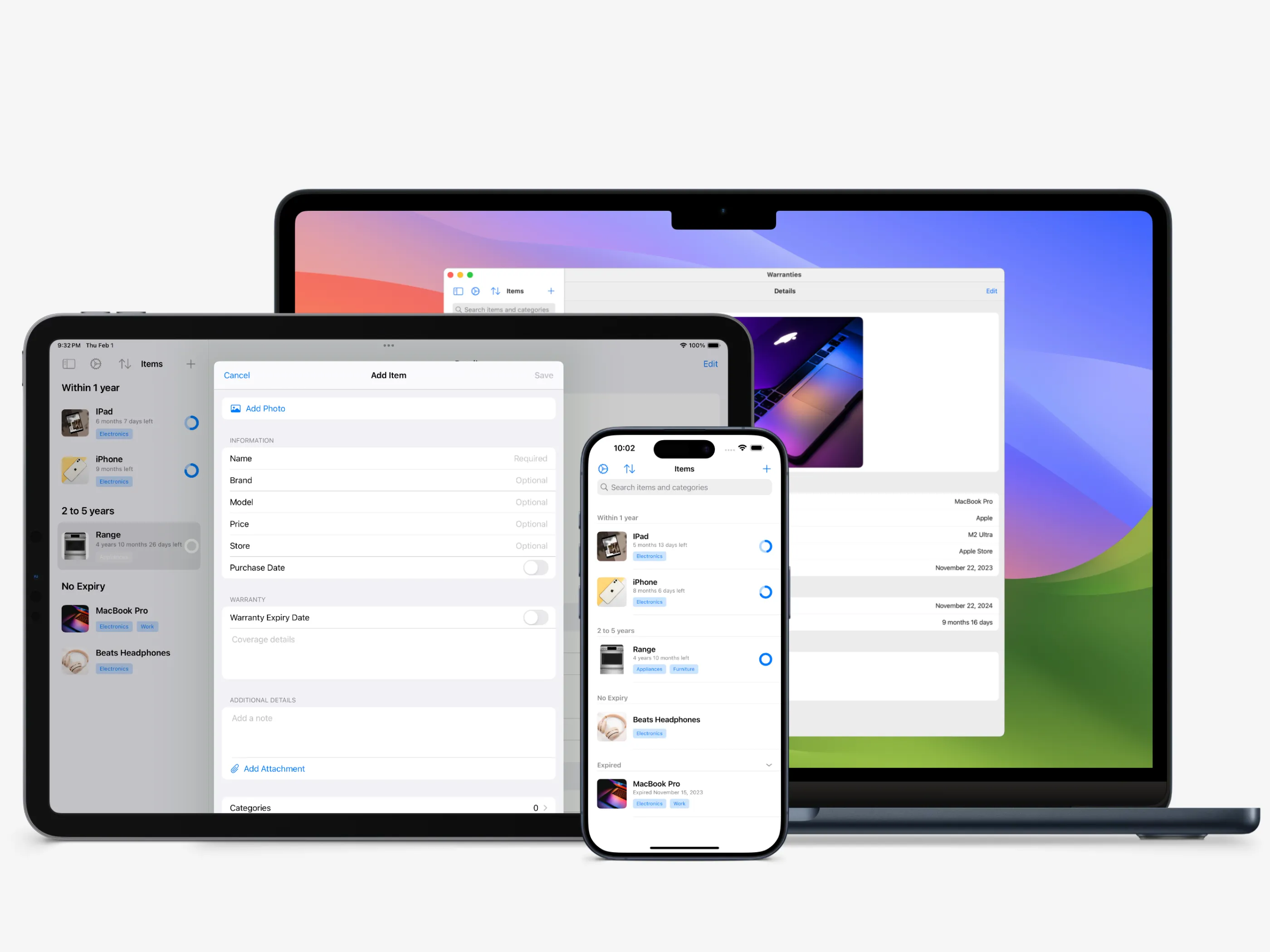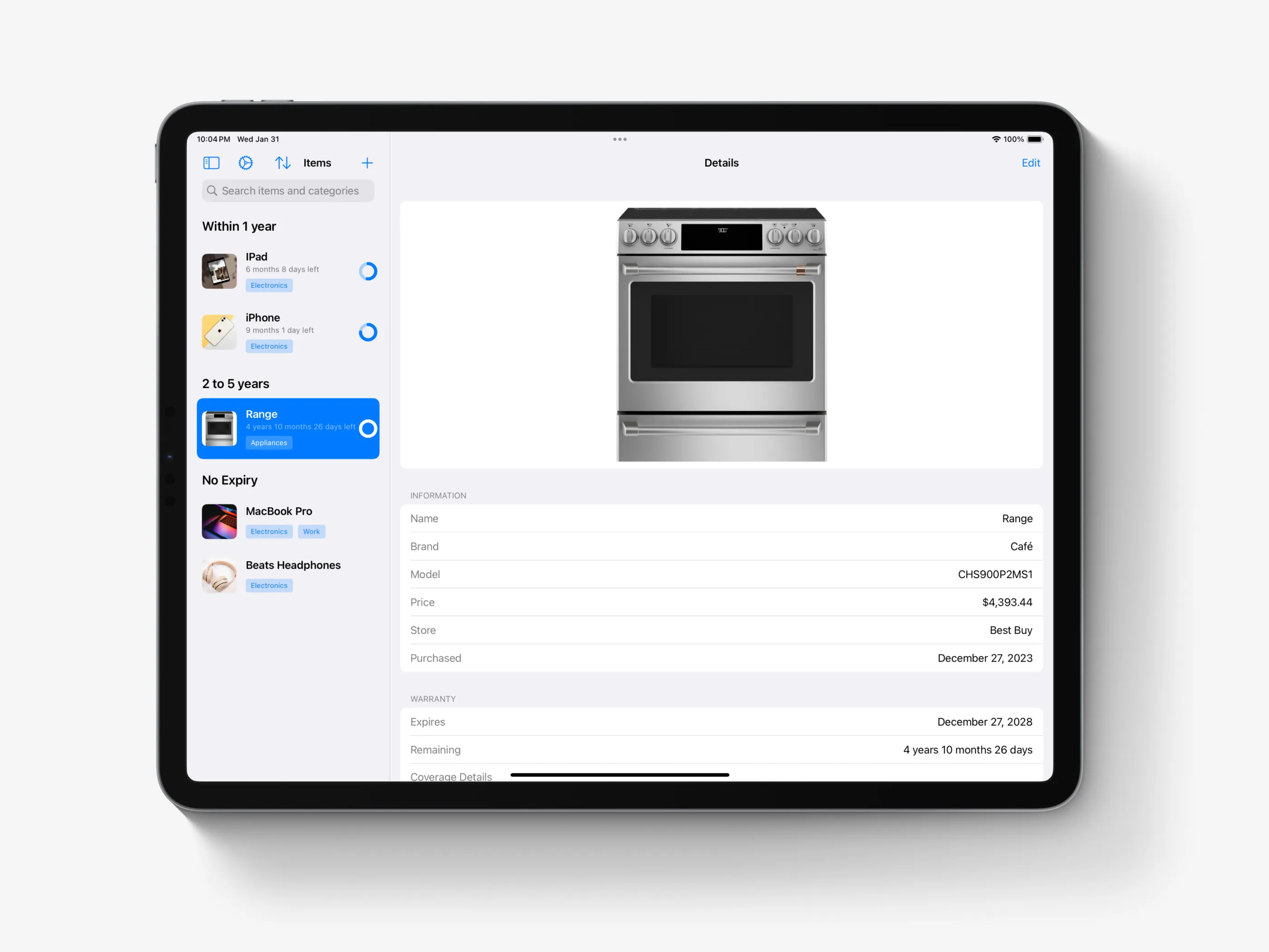 Warranties showcases my expertise in iOS app development and design. This self-created app transforms warranty management, offering features like real-time notifications, a clean interface, and comprehensive document management.